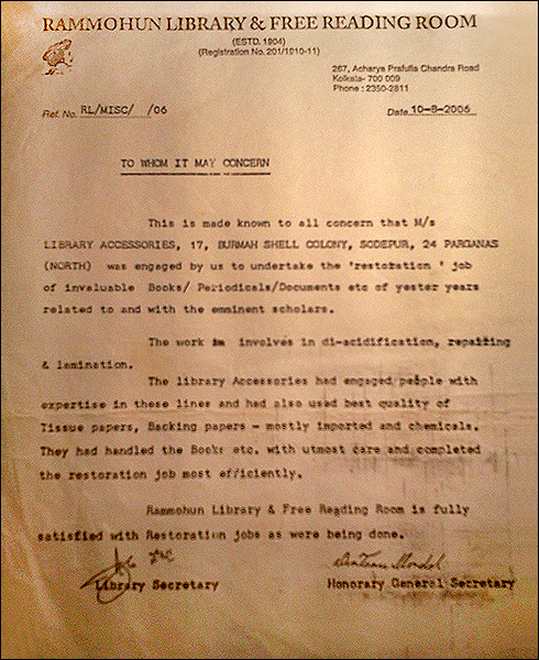 >> Letter from Rammohun Library